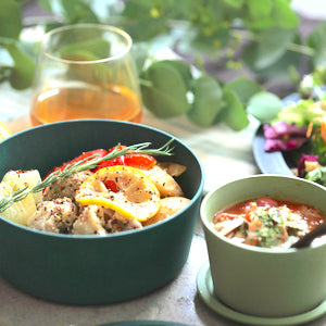 素材の開発から話し合いを重ね、試行錯誤を繰り返して完成した樹脂製の器「9°(クド)」は2018年に『グッドデザイン賞』を受賞。