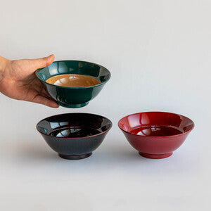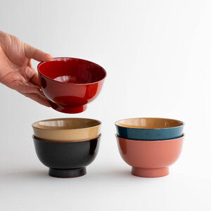 割れにくい素材で作った素地を包んでいるのは、「MRマルチロール漆」という特殊な漆。丈夫で剥がれにくいため、漆器でありながらも食洗機の使用やスタッキングが可能に。また光沢度の高さも特徴のひとつです。