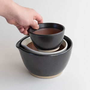 「もとしげ」こと元重製陶所は、大正14年からすり鉢を専門に手掛ける石見焼(いわみやき)の作り手。 石見焼は、18世紀より作られている島根県江津市を中心とした石見地方の焼き物です。 高温で焼きあげ耐久性に優れることから「はんど」と呼ばれる「かめ」のような大型の貯蔵容器をはじめ、こうしたすり鉢の製造でも有名な産地です。 内側の「くし目」は、専用の道具を使って一つ一つ手仕事でつけられています。すり味が全く違うのです。こうして人の手がかかりながらも、徹底的に生産を効率化することで手頃な価格に抑えられていることも特徴です。