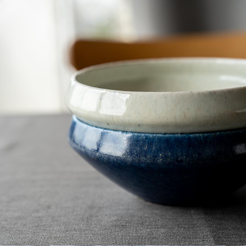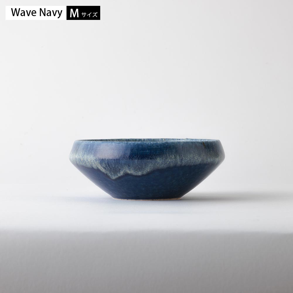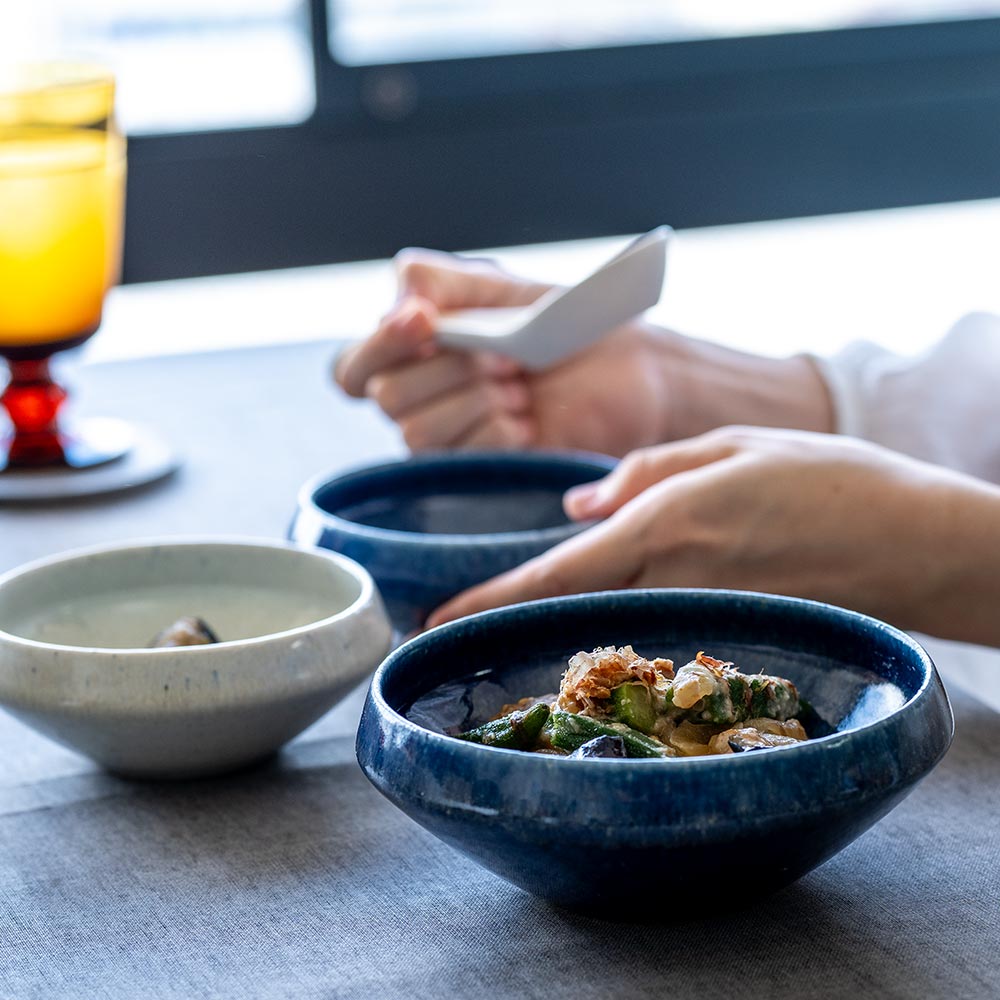 Wave Navyは深く静かな海のような青、Wave Whiteは柔らかな陽光を思わせる白。どちらも青や白の一色ではなく、色の濃淡や風合いの違いをのぞかせます。色味はどちらも料理の彩りをやさしく引き立て、食卓に静かなアクセントを与えてくれます。