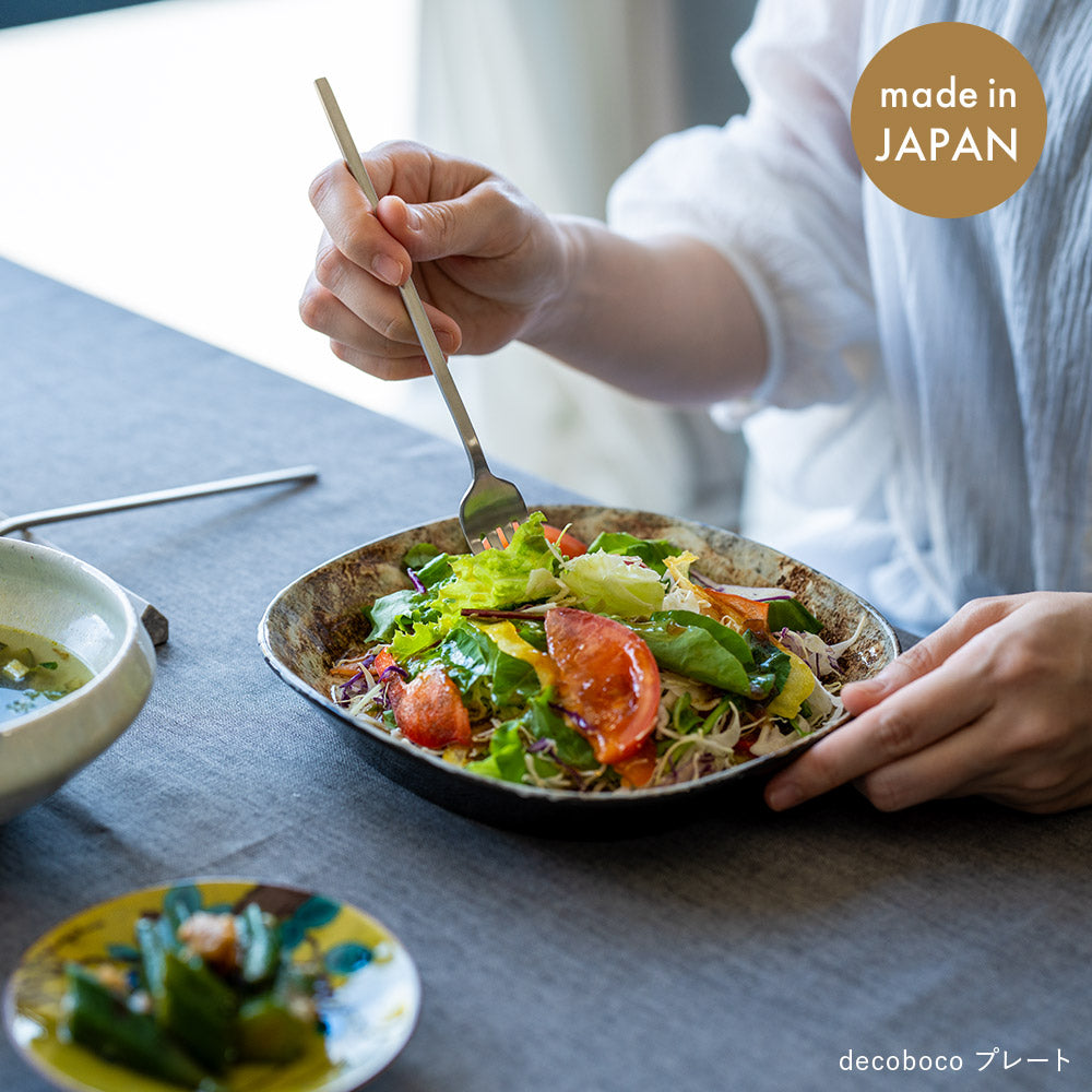 「decoboco(デコボコ) プレート」は、表面のほんの少しの凹凸や釉薬の風合い、軽やかな持ち心地が魅力のうつわです。ひとつひとつ異なる表情を持ち、どの角度から見ても飽きがきません。汁気のある料理にも使いやすく、日常の食卓をほんの少し上質にしてくれるプレートです。