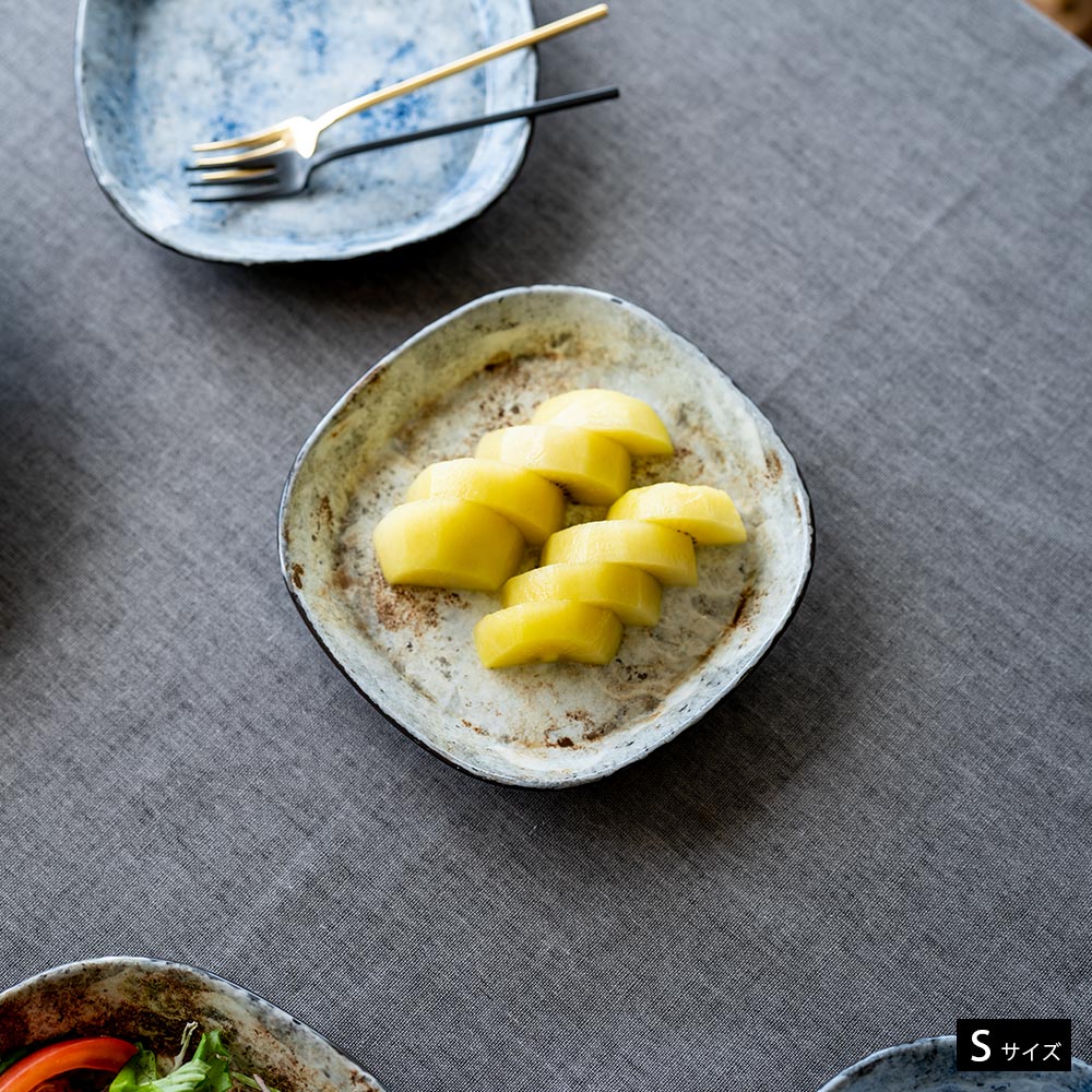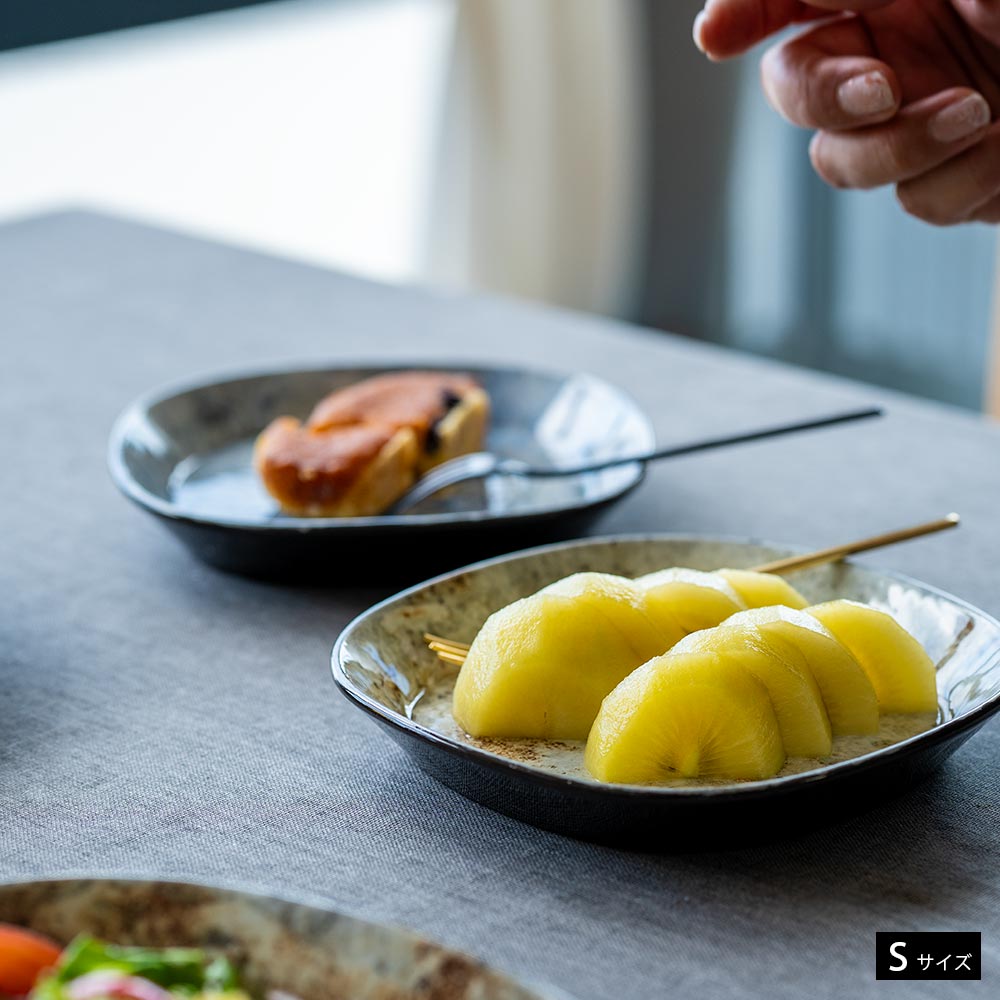 サイズはSMLの3種類。Sは取り皿やちょっとしたデザートを乗せるのにちょうどいいサイズ。MやLは料理の量に応じて、メイン料理や副食など様々な使い方ができます。比較的薄めのため、スタッキングしても食器棚の中で圧迫しない魅力もあります。色違いやサイズ違いで、少しずつ揃えていくのも◎です。