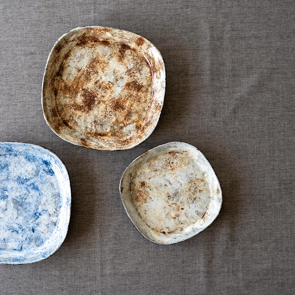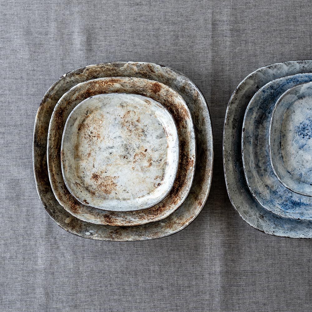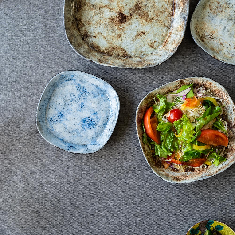 手間ひまかけて作られたプレートたちは、どれもひとつだけの表情を持っています。ふとした瞬間に目を引くような、個性とあたたかさを感じさせてくれる器です。