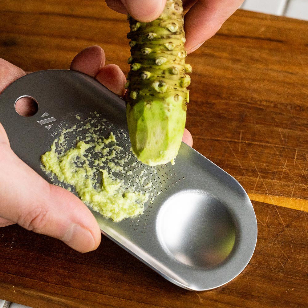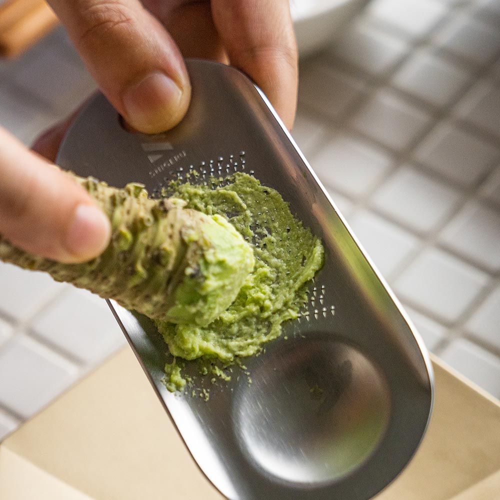 わさびに。0.3ミリという低めの刃付けで、やさしく擦りつけるようにおろせる仕様。 練りおろす感覚で、わさび本来の辛味・甘み・香りをしっかりと引き出します。