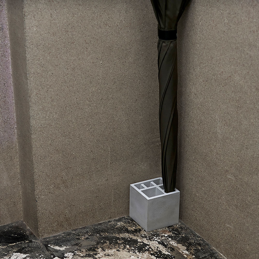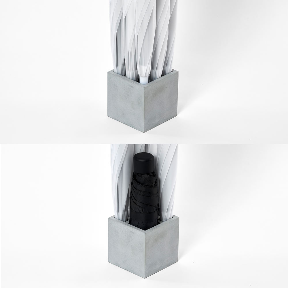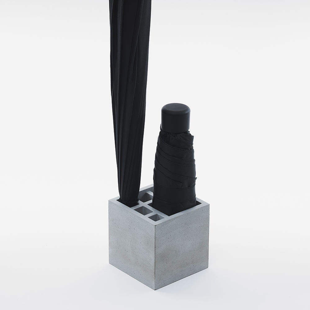 無駄をそぎ落としたデザインと、モルタルの素朴で静かな佇まいが、空間に心地よく馴染みます。長傘も折りたたみ傘も美しく収まり、使わない時もインテリアの一部として成立する、そんな傘立てです。
