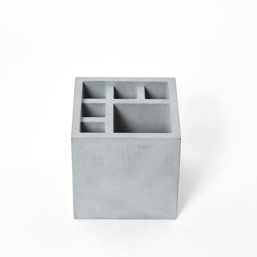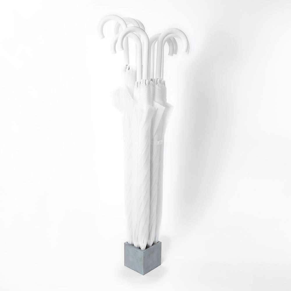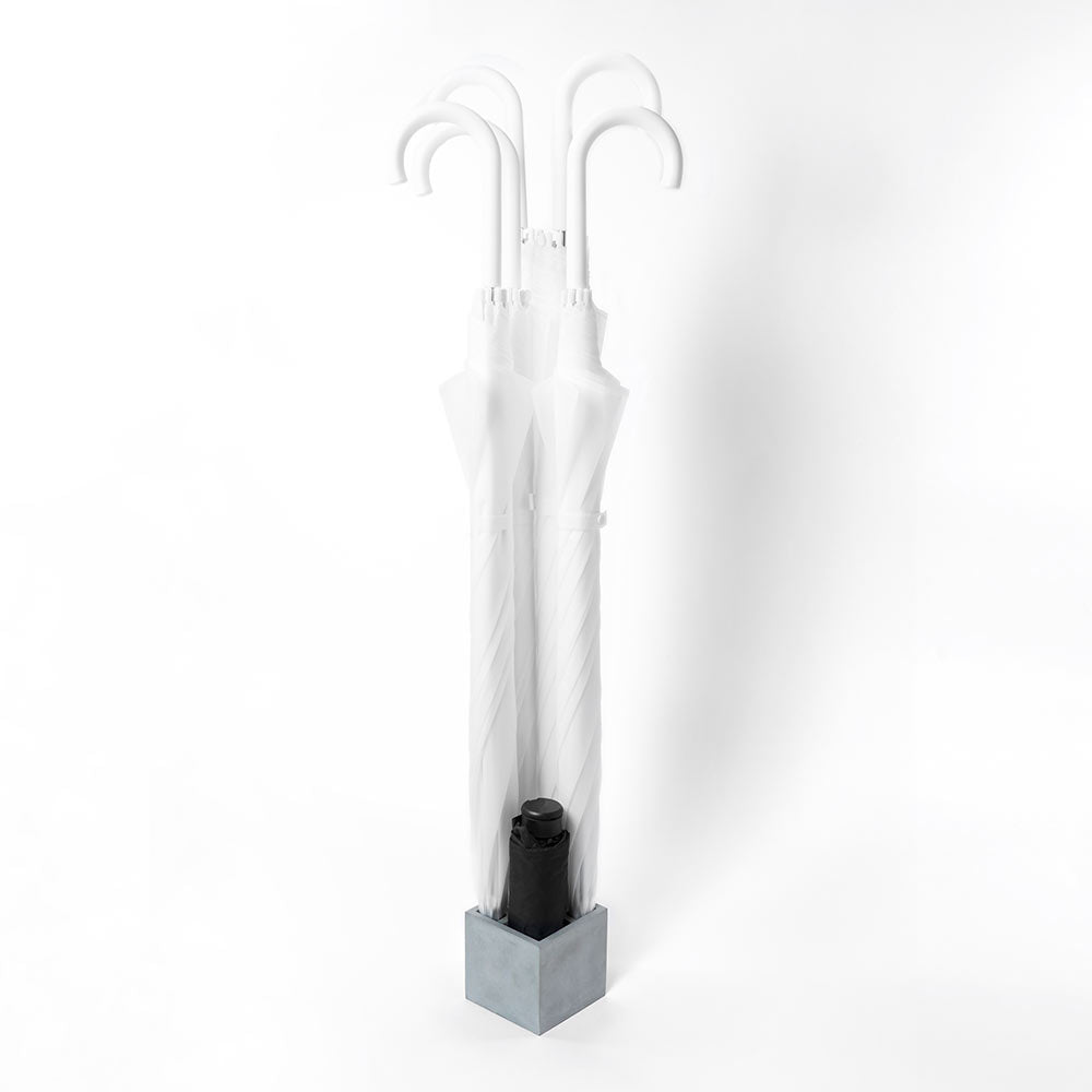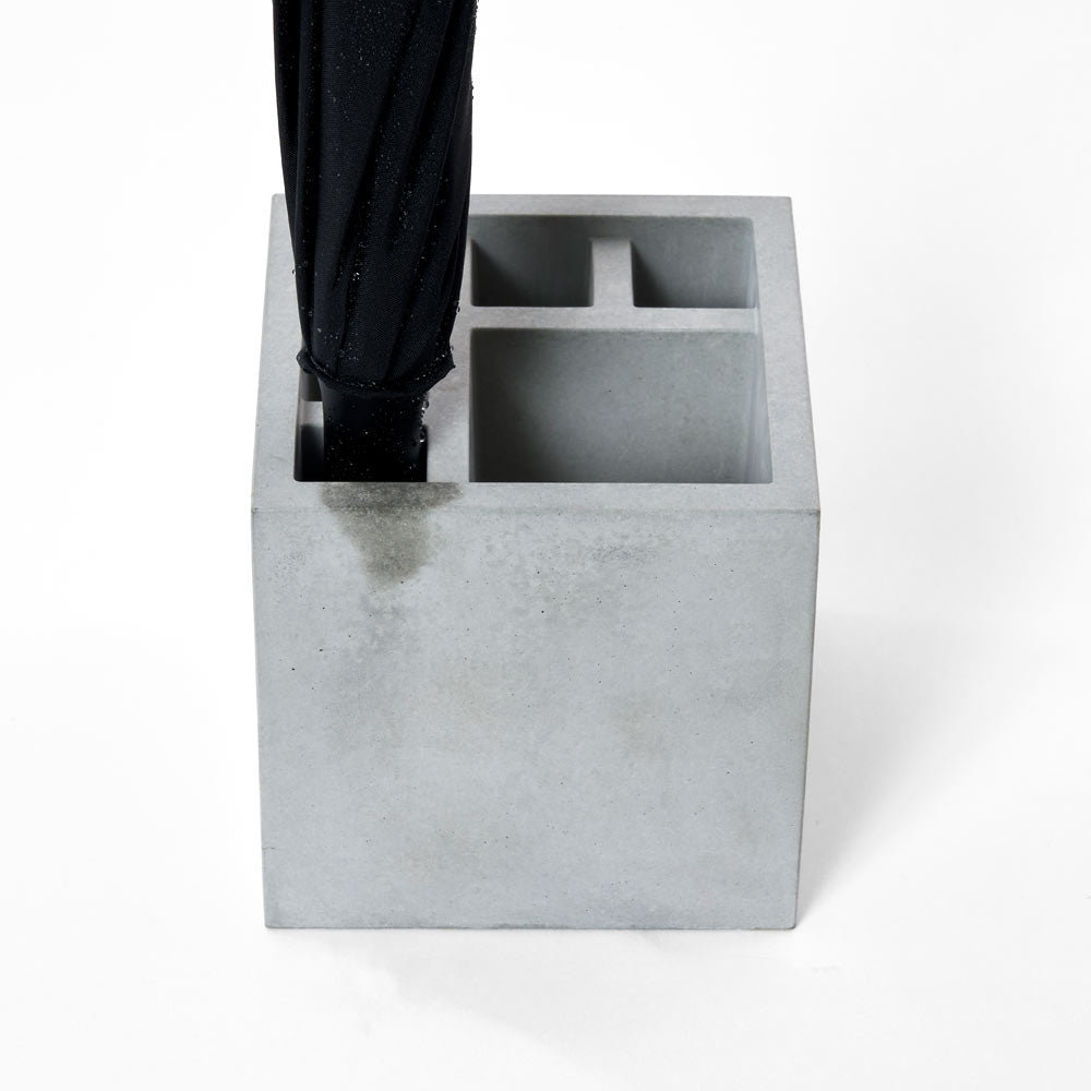 無駄をそぎ落としたデザインと、モルタルの素朴で静かな佇まいが、空間に心地よく馴染みます。長傘も折りたたみ傘も美しく収まり、使わない時もインテリアの一部として成立する、そんな傘立てです。