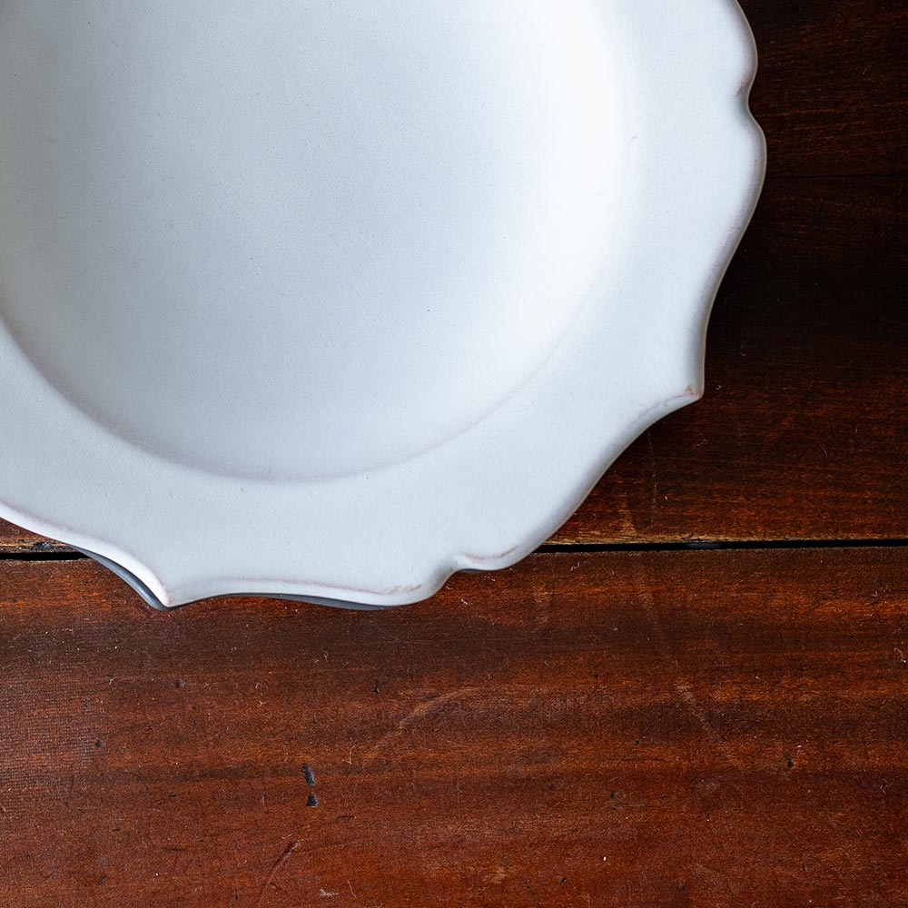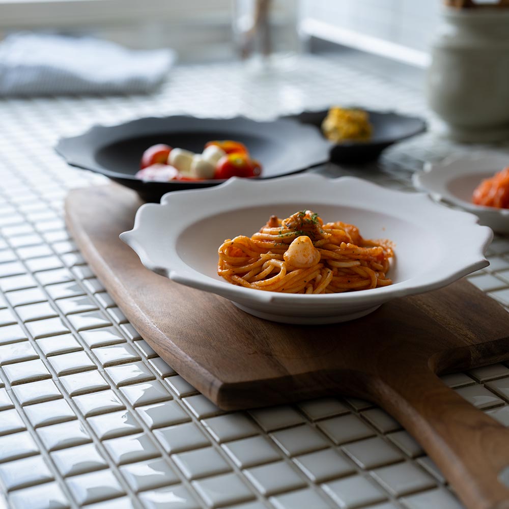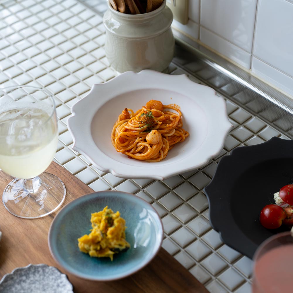 縁のゆるやかな波打ちが、どんな料理もやさしく包み込んでくれるような印象を与えます。和食にも洋食にもよくなじむかたちは、日常づかいにも、ちょっとしたおもてなしの器としても頼れる一枚です。