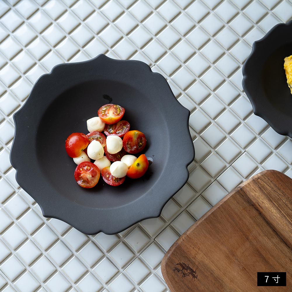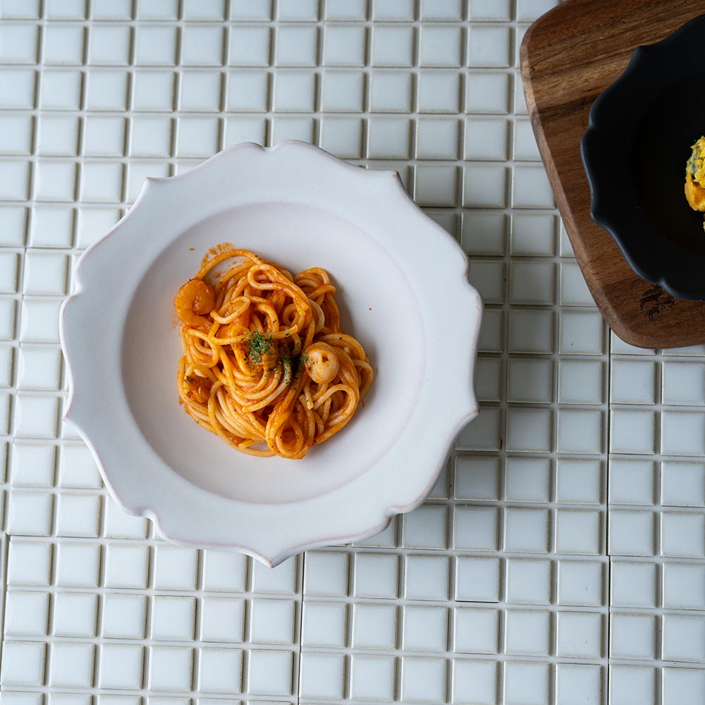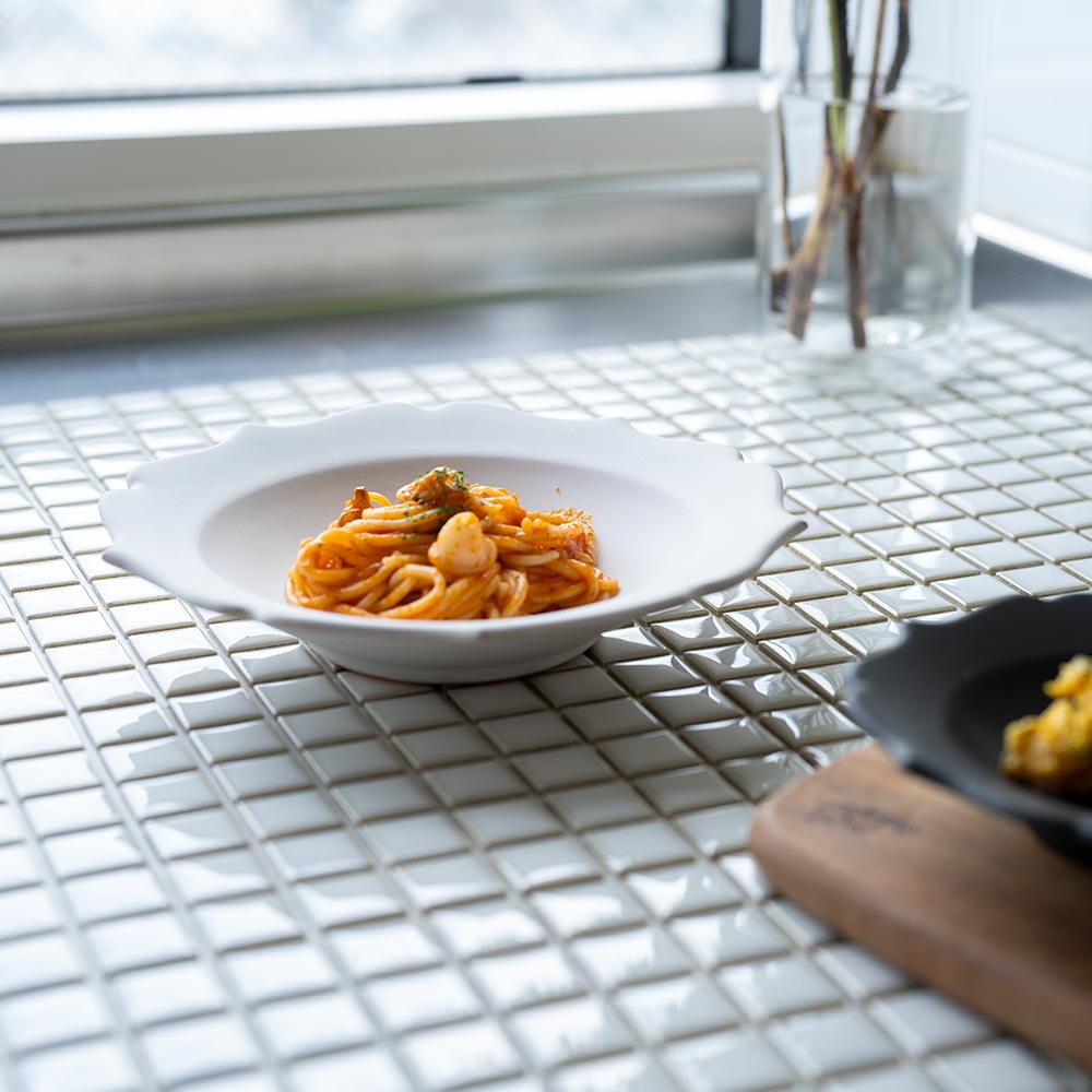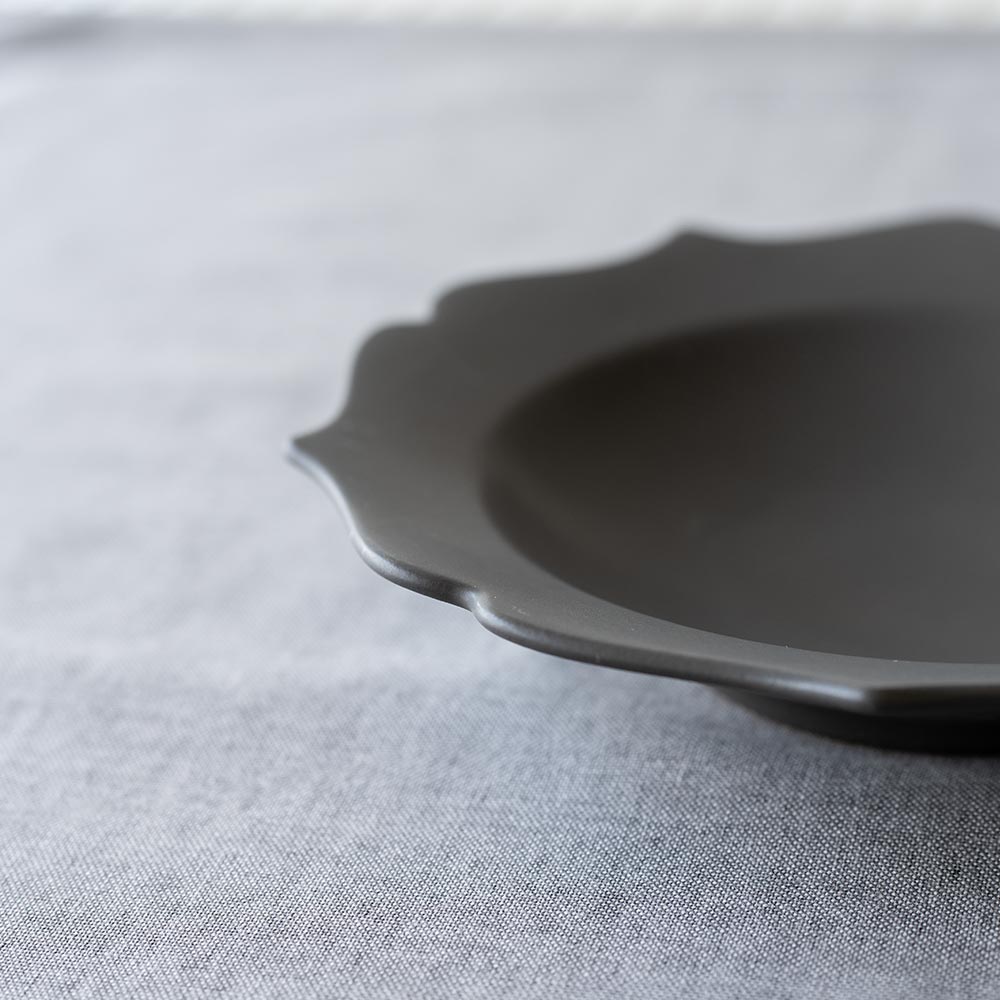 縁のゆるやかな波打ちが、どんな料理もやさしく包み込んでくれるような印象を与えます。和食にも洋食にもよくなじむかたちは、日常づかいにも、ちょっとしたおもてなしの器としても頼れる一枚です。