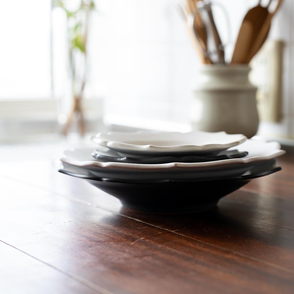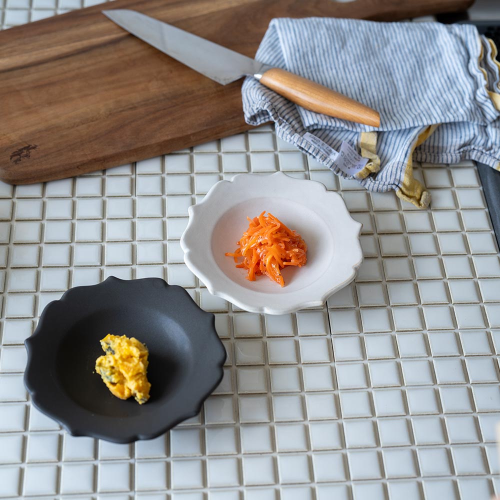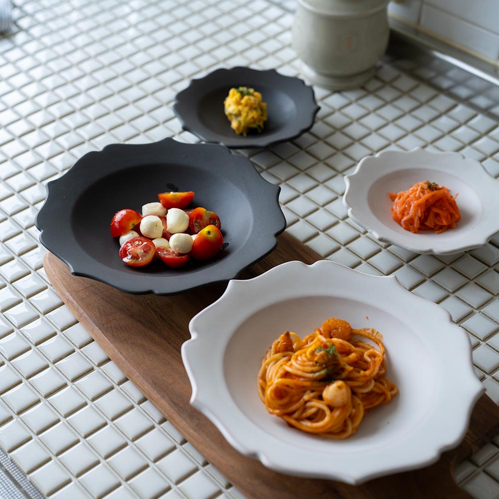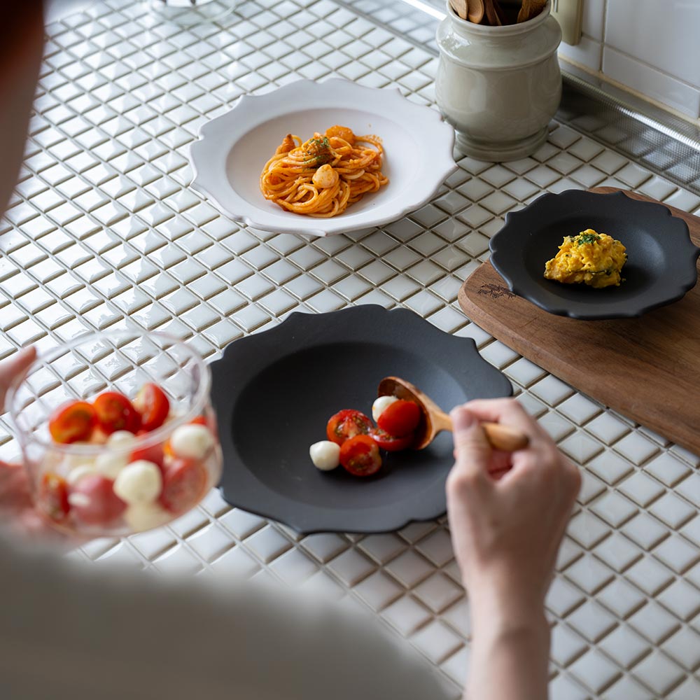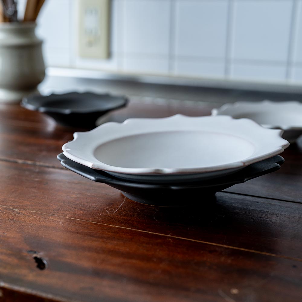 釉薬は光沢を抑え、マットな質感に仕上げられています。ホワイトはやわらかく上品な印象に、ブラックは料理に凛とした雰囲気を添えてくれるような佇まい。