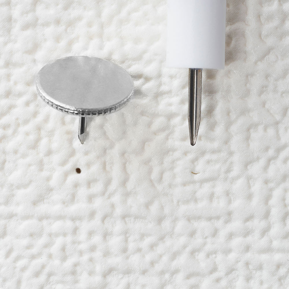 この画びょうの一番の特長は、ピン先のV字形状。通常のピンに比べて、壁に残る穴が格段に目立ちにくくなっています。