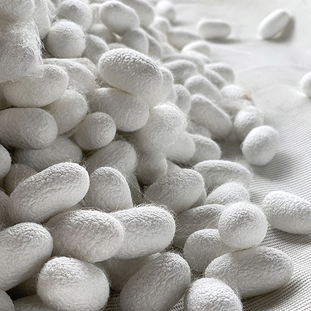 繭から特殊な方法で製糸した網状生糸を使用し、空気を含んだ構造が特徴です。