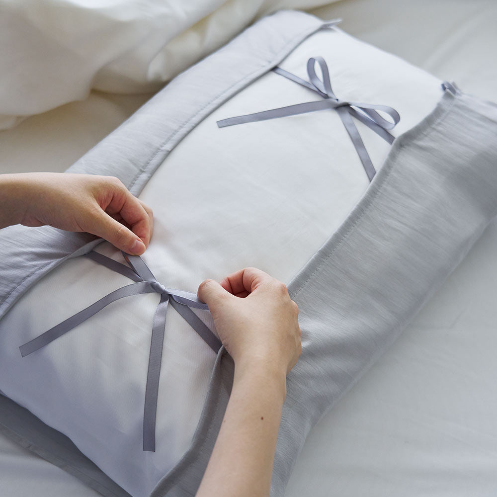 枕のサイズに合わせて裏側のリボンで調節できます。標準の枕(60cm)がぴったり隠れるサイズ感。