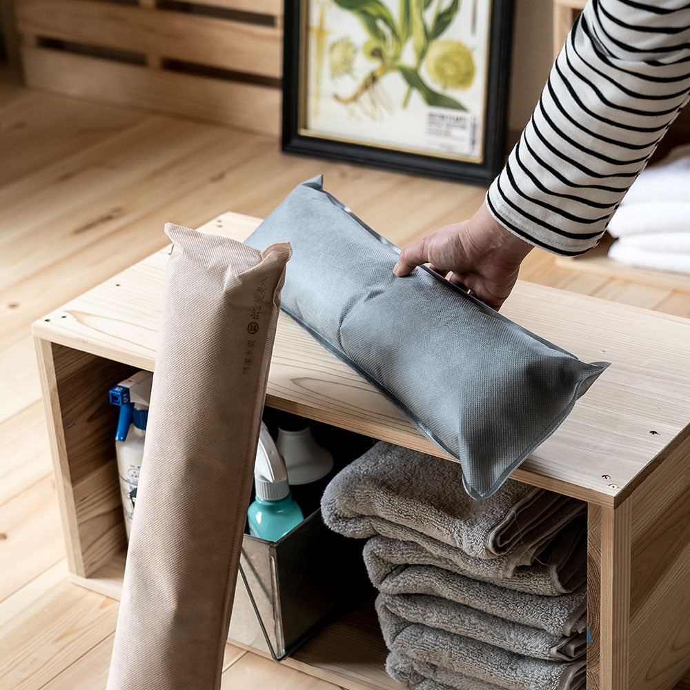 空気がジメジメすると吸湿、空気が乾いたら放湿、炭が呼吸するように調湿を行い気になる悩みを軽減します。