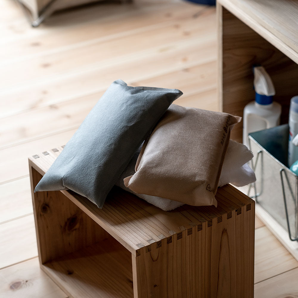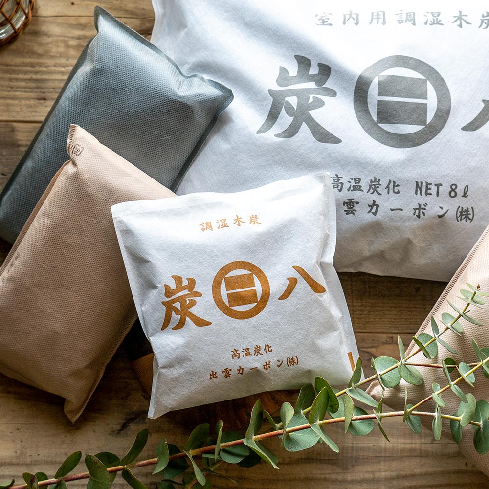 炭八は余分な湿気とイヤなニオイを取り除く「調湿木炭」です。 空気がジメジメすると吸湿、空気が乾いたら放湿、炭が呼吸するように調湿を行い気になる悩みを軽減します。 交換不要、月1回を目安に天日干しをするだけで繰り返し使えます。