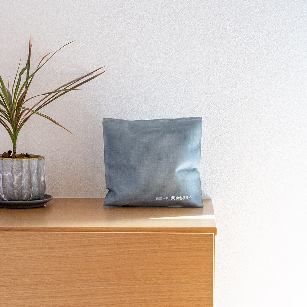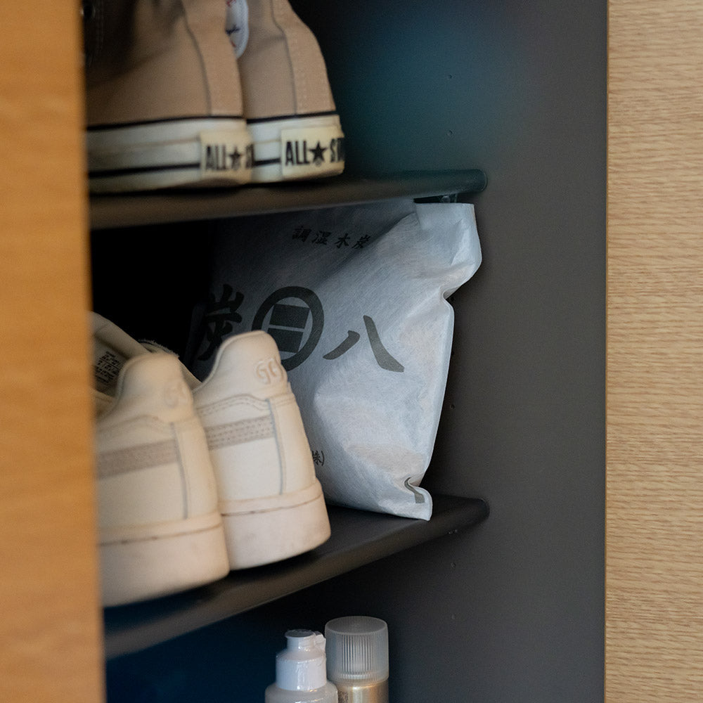 炭八は余分な湿気とイヤなニオイを取り除く「調湿木炭」です。 空気がジメジメすると吸湿、空気が乾いたら放湿、炭が呼吸するように調湿を行います。 カビやダニ予防にも効果があります。 薬剤不使用なので、お子さまやペットのいるご家庭でも安心してお使いいただけます。