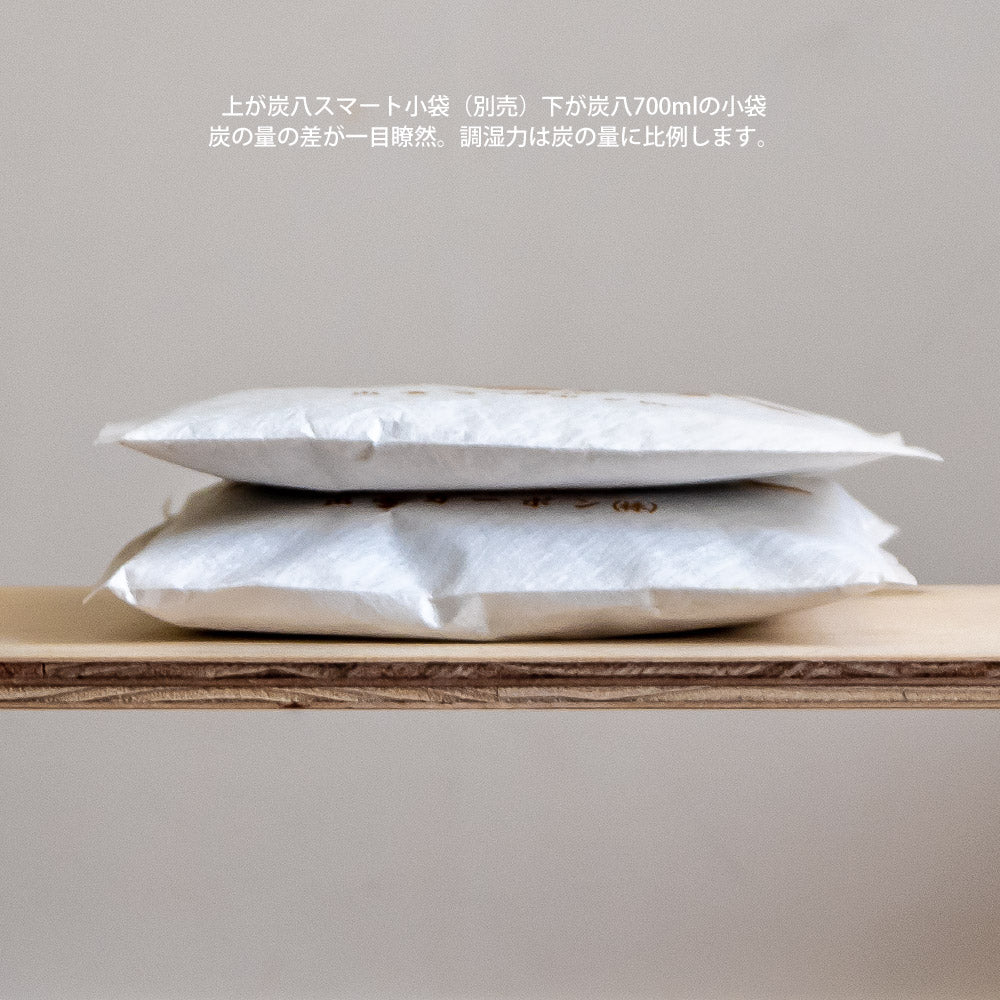 炭八小袋(700ml)は、薄型スマート小袋(400ml)と比べて約1.75倍増量!! サイズは同じ19センチ角で、厚みが異なります。 吸湿量がアップするため、より高い効果を求める方におすすめのサイズです。 靴箱・バッグ・引き出し・ロッカー・戸棚など、湿気やニオイなど気になる場所にご使用ください。