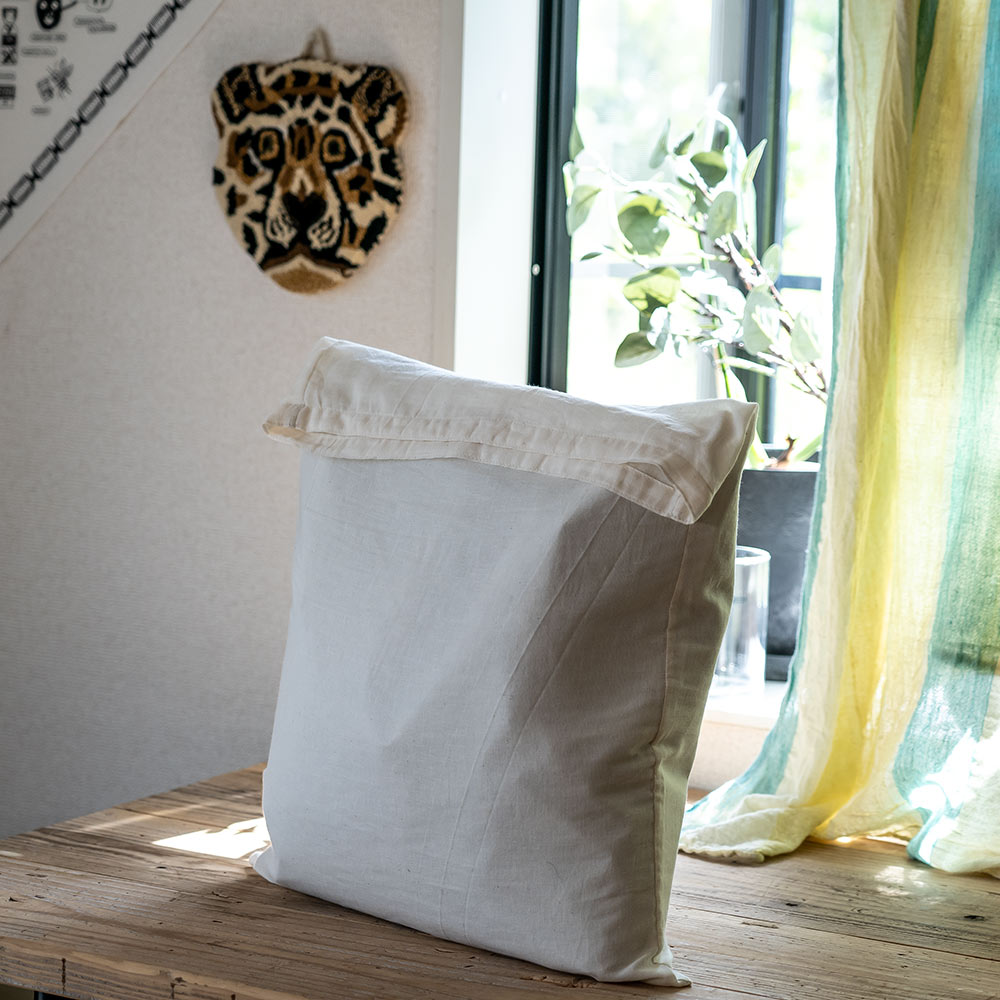 口部分は裾処理のみを施しただけのシンプルな袋状、 従来のクッションカバーよりも縦幅を10cm長くすることで、 折り曲げたり、口部分を折り曲げてお好みの位置まで炭八をのぞかせておくことも可能です。