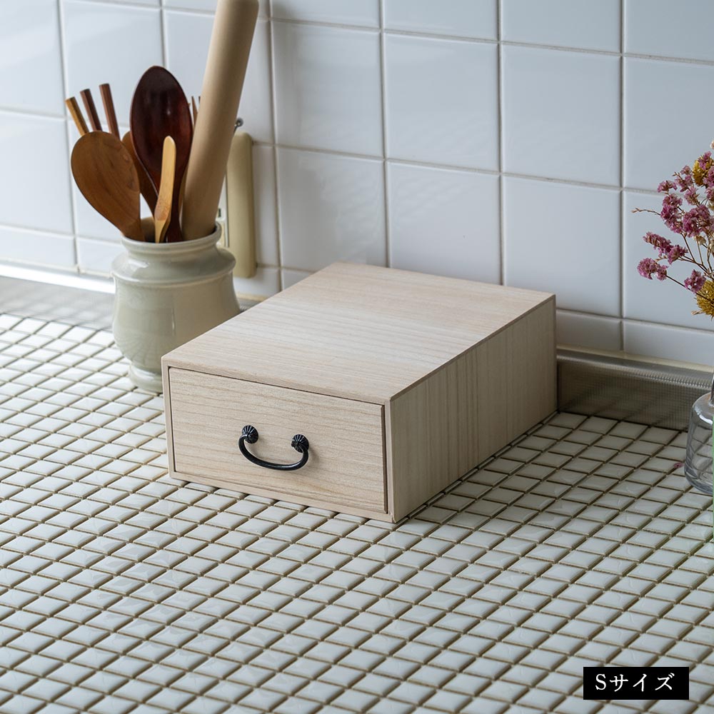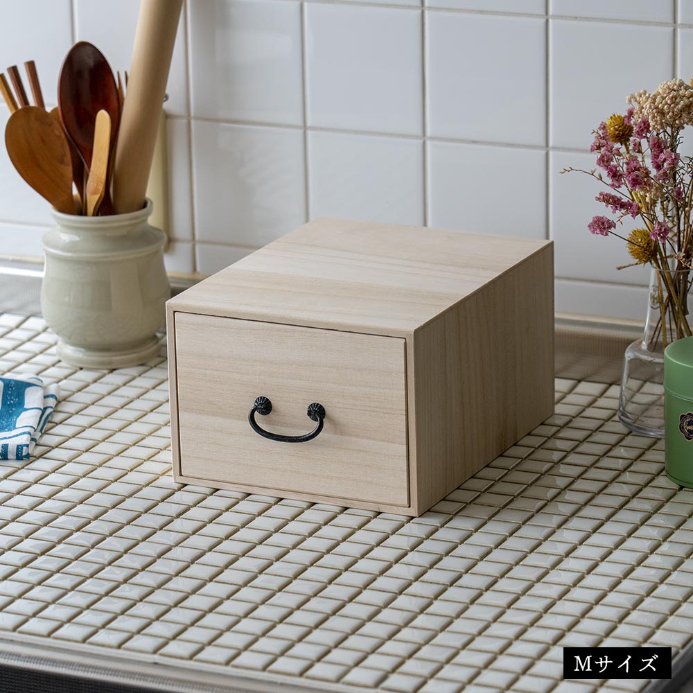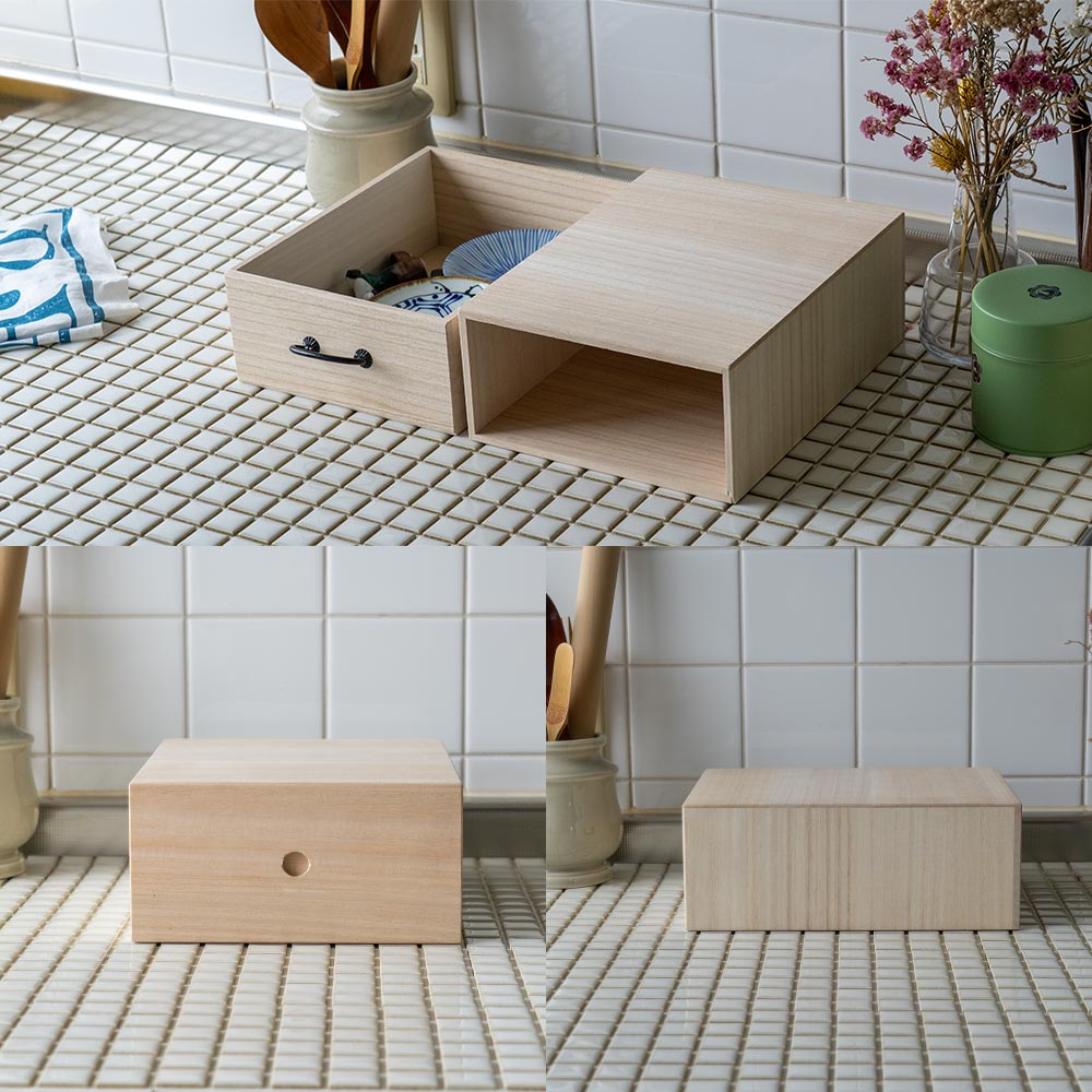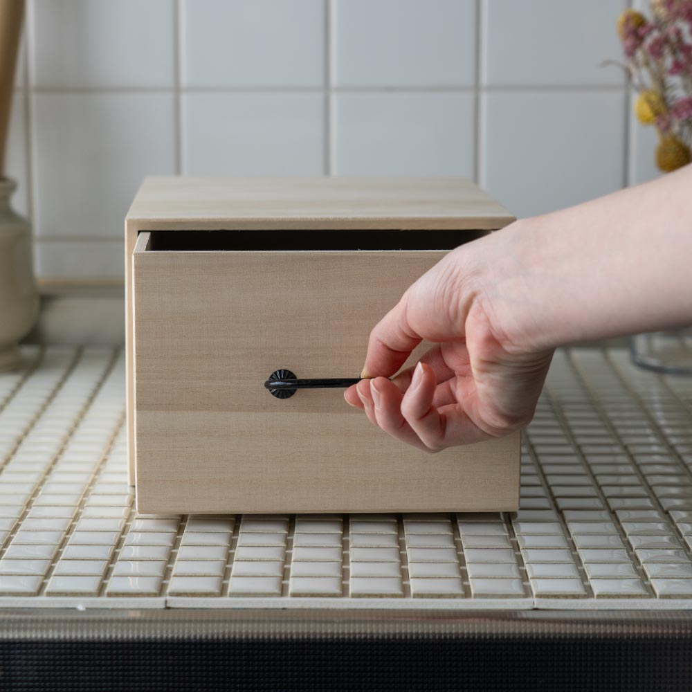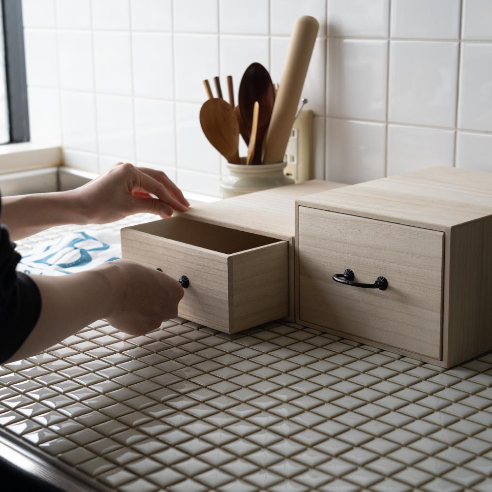 テーブルや棚にそのまま置ける、“見せ置き”できるデザイン。 取手にはどこか懐かしさを感じるレトロなパーツをあしらい、桐たんすのような風合いに仕上げました。 素材は、調湿性・防虫性に優れた桐材を使用。 ナチュラルな木目とやさしい手触りが、使うたびに気持ちを穏やかにしてくれます。 すべて、国内の老舗桐箱メーカーで職人が一点一点、丁寧に製作。長く使える、確かなつくりです。