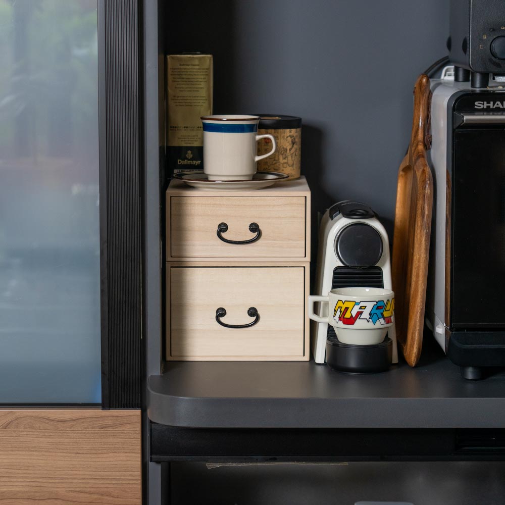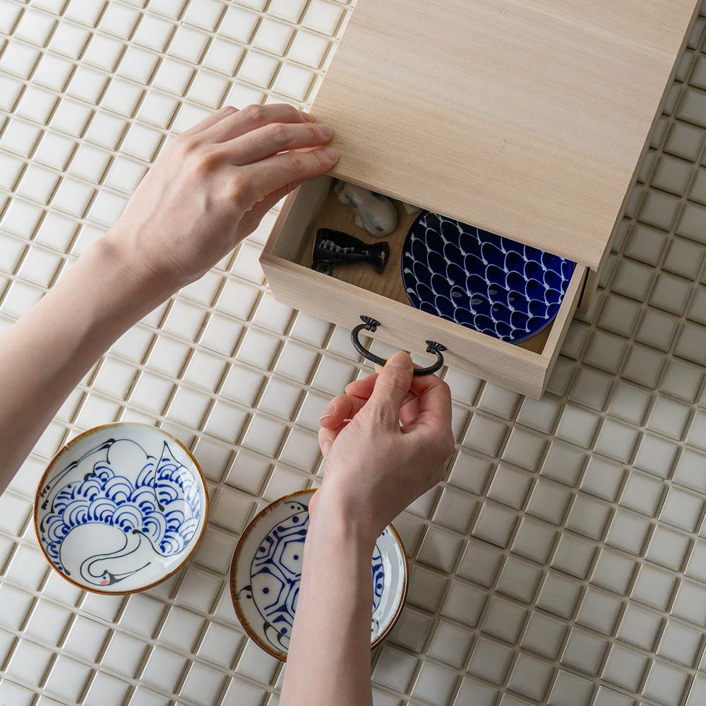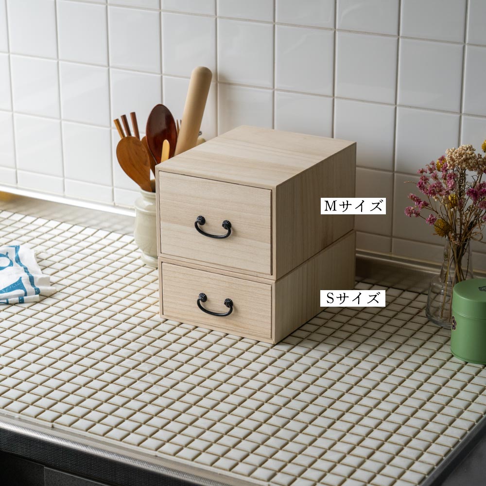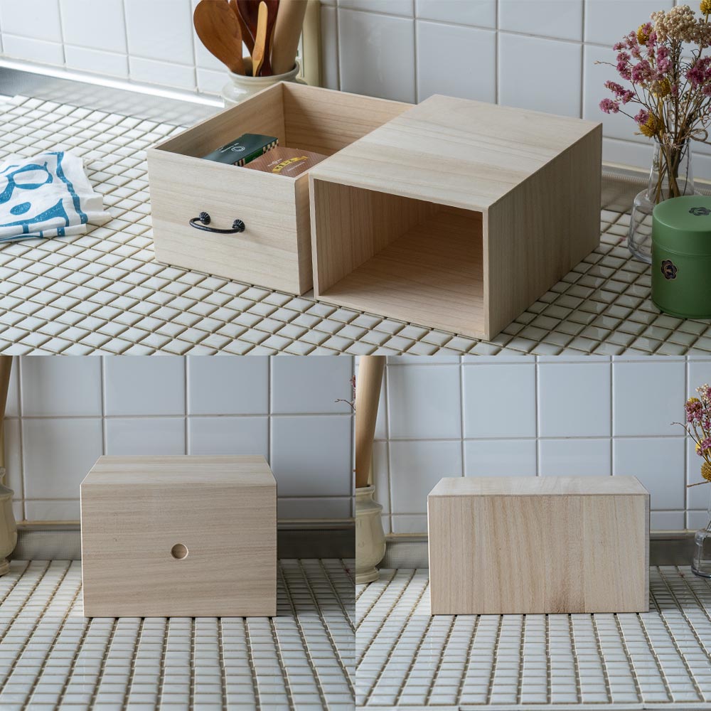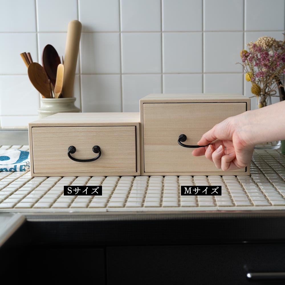 テーブルや棚にそのまま置ける、“見せ置き”できるデザイン。 取手にはどこか懐かしさを感じるレトロなパーツをあしらい、桐たんすのような風合いに仕上げました。 素材は、調湿性・防虫性に優れた桐材を使用。 ナチュラルな木目とやさしい手触りが、使うたびに気持ちを穏やかにしてくれます。 すべて、国内の老舗桐箱メーカーで職人が一点一点、丁寧に製作。長く使える、確かなつくりです。
