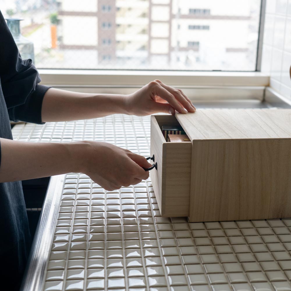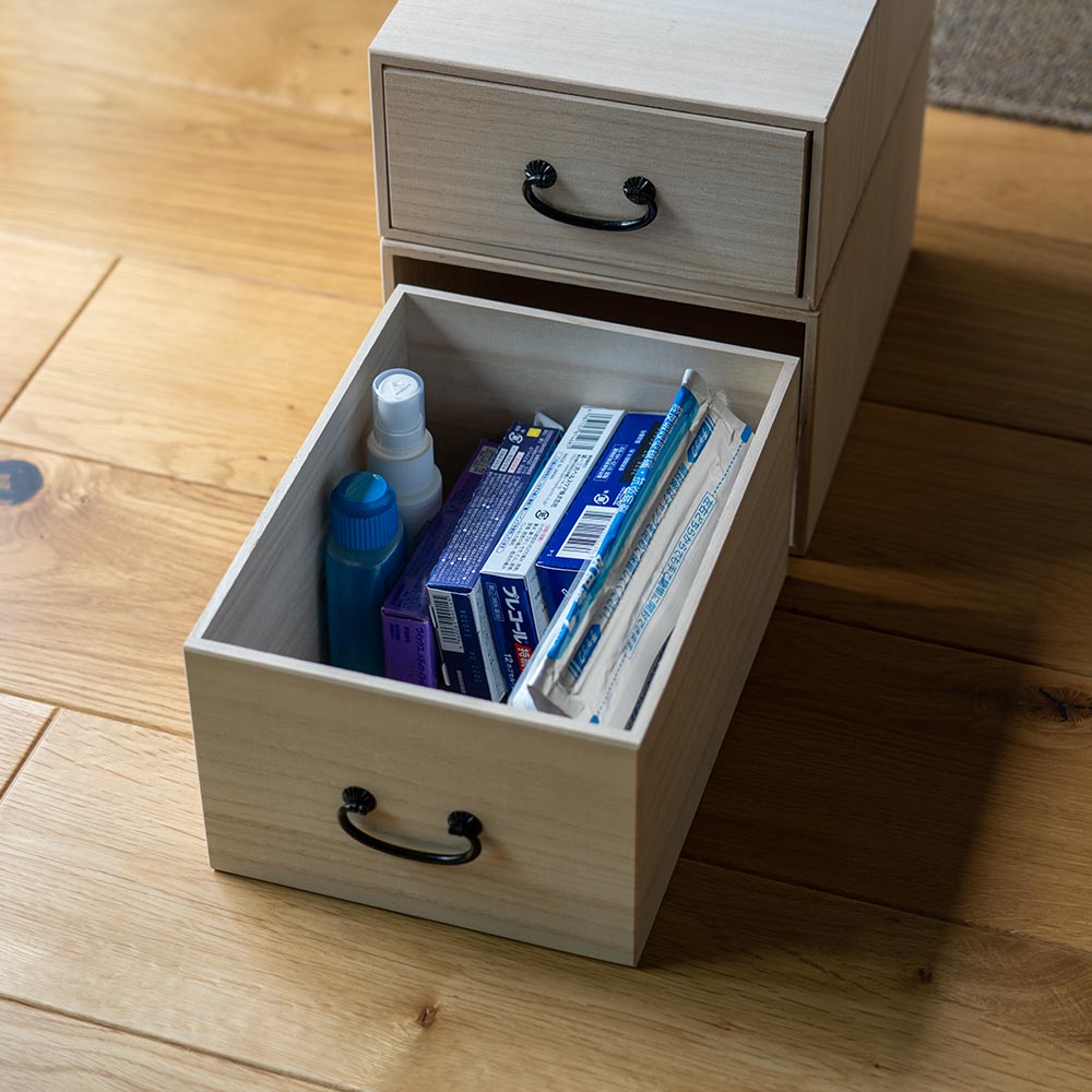この薬箱は「引き出し式」なので、開けた瞬間に中身がひと目でわかり、必要なものをサッと取り出せます。 本体を動かす必要もなく、棚やカウンターに置いたままで使えるのも嬉しいポイント。 「使いやすさ」へのこだわりが、毎日の小さなストレスを手放すお手伝いをします。