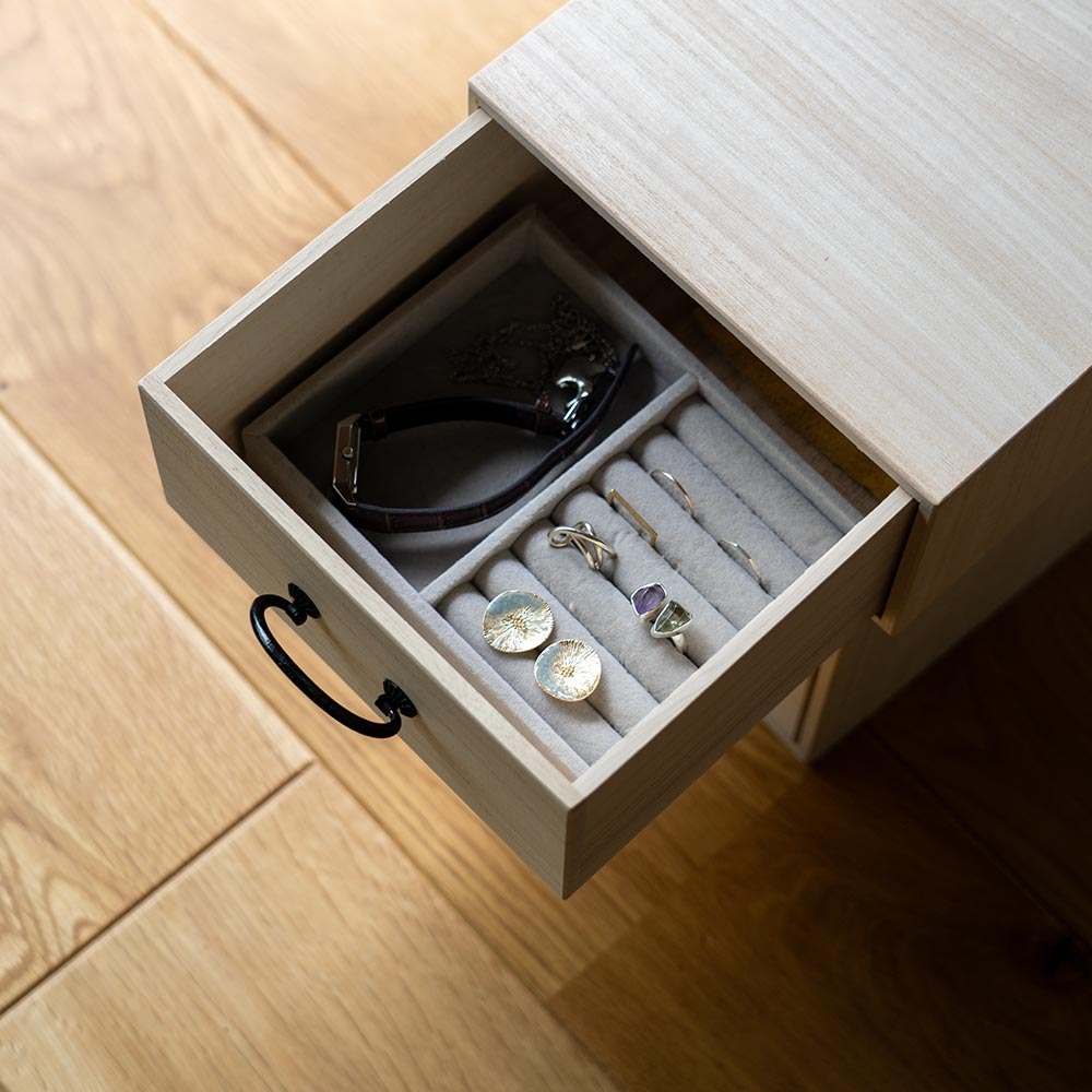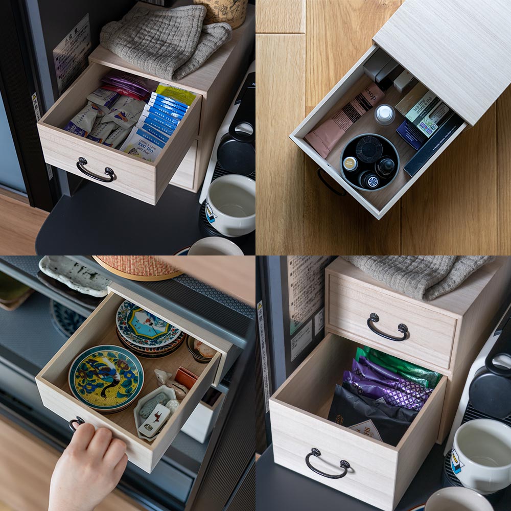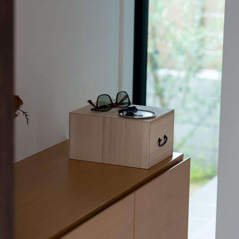 調湿性・防虫性に優れた「桐」は、昔からタンスや薬箱など、暮らしに欠かせない道具に使われてきました。 祖父母の家で、あるいはアンティークのお店で、一度は目にしたことがあるのではないでしょうか。 空間に静かにたたずむその姿は、まるで時を超えて、私たちの暮らしを見守ってきたかのよう。 そんな桐の収納を、現代のライフスタイルに合わせて新しくお作りしました。