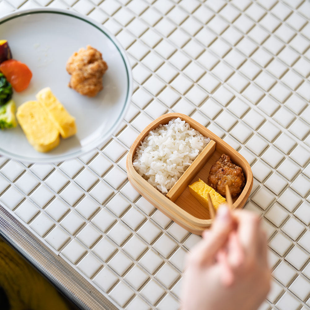 木が呼吸することでご飯の水分をほどよく調整し、冷めてもおいしさをキープ。さらに、ヒノキ特有の抗菌・制菌作用により、食材が傷みにくいのも特長です。